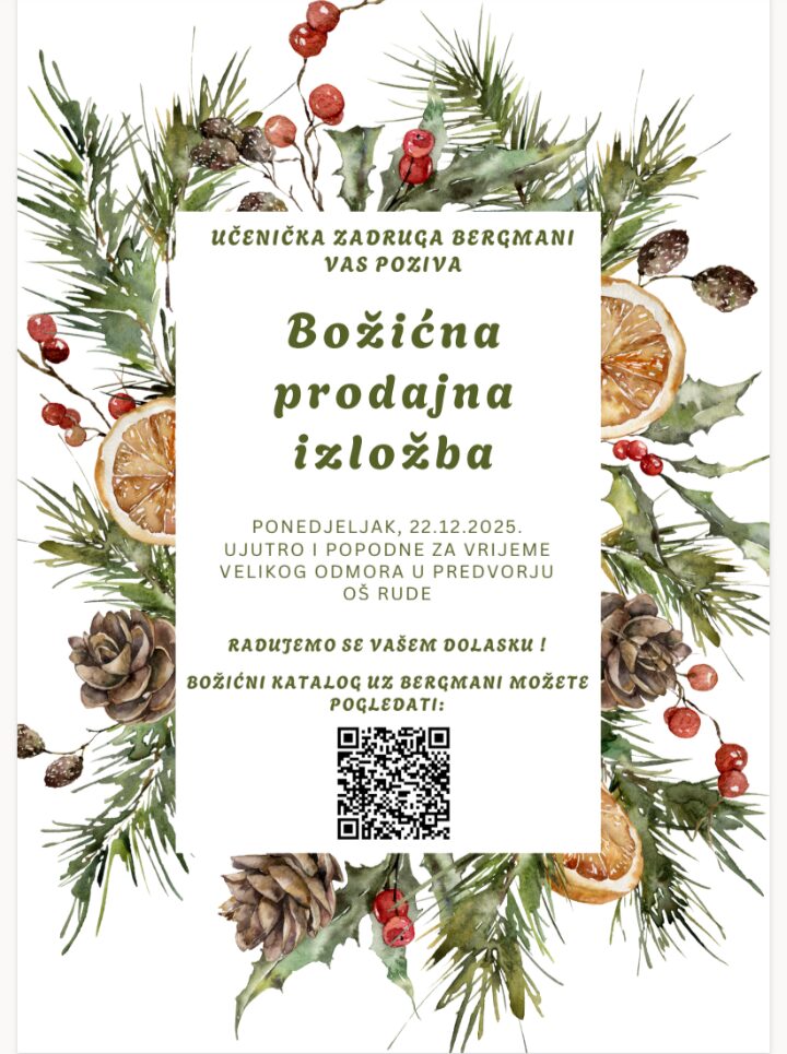 Učenička zadruga Bergmani, u ponedjeljak, 22. prosinca 2025. godine, poziva na Božićnu prodajnu izložbu koja će se održati ujutro i poslijepodne za vrijeme velikog odmora u predvorju Osnovne škole Rude. Katalog proizvoda može se pregledati skeniranjem QR koda.